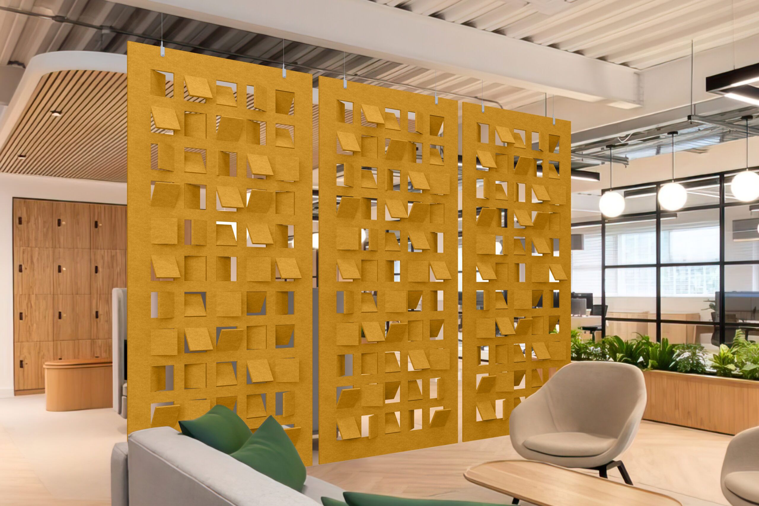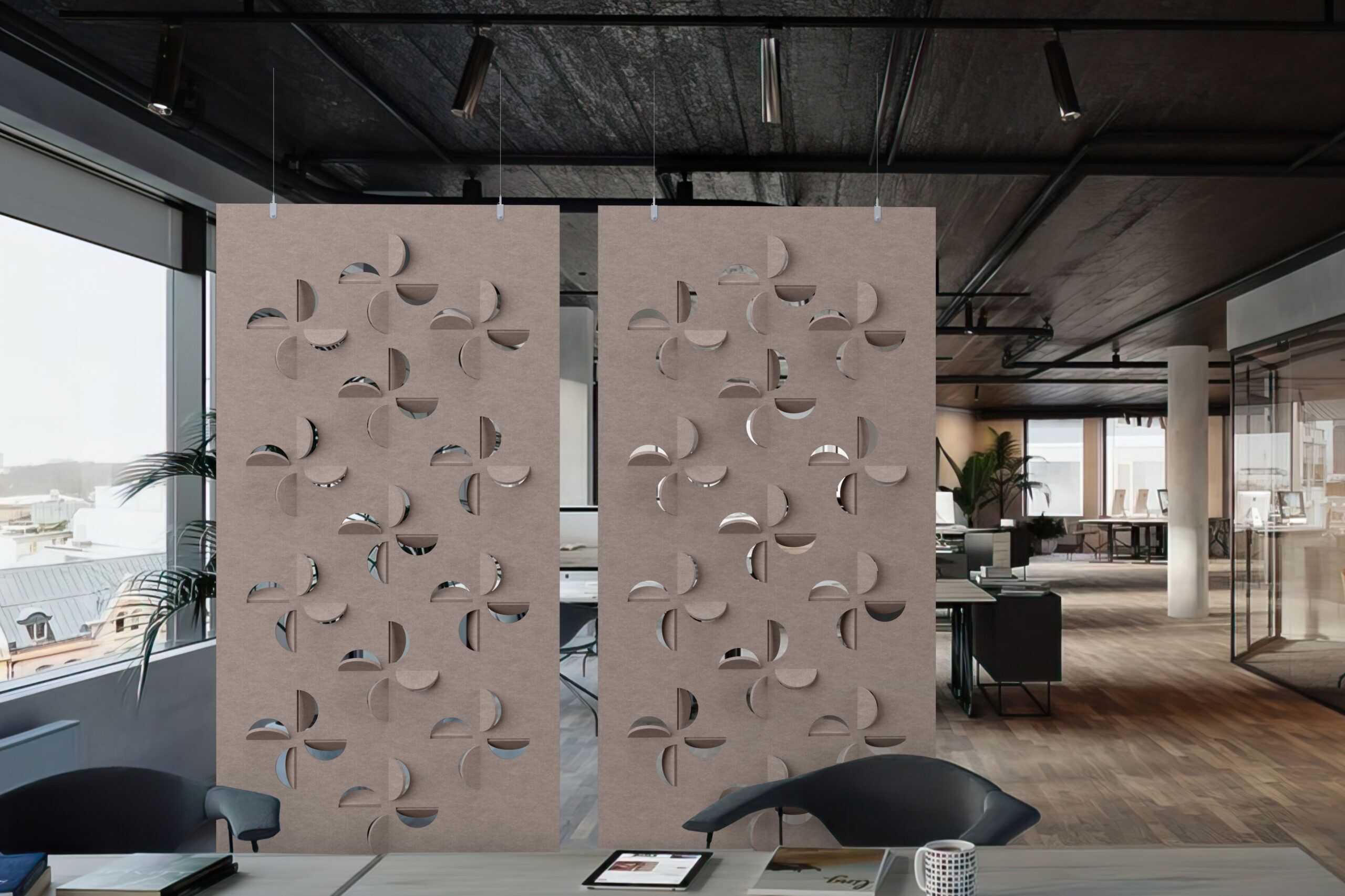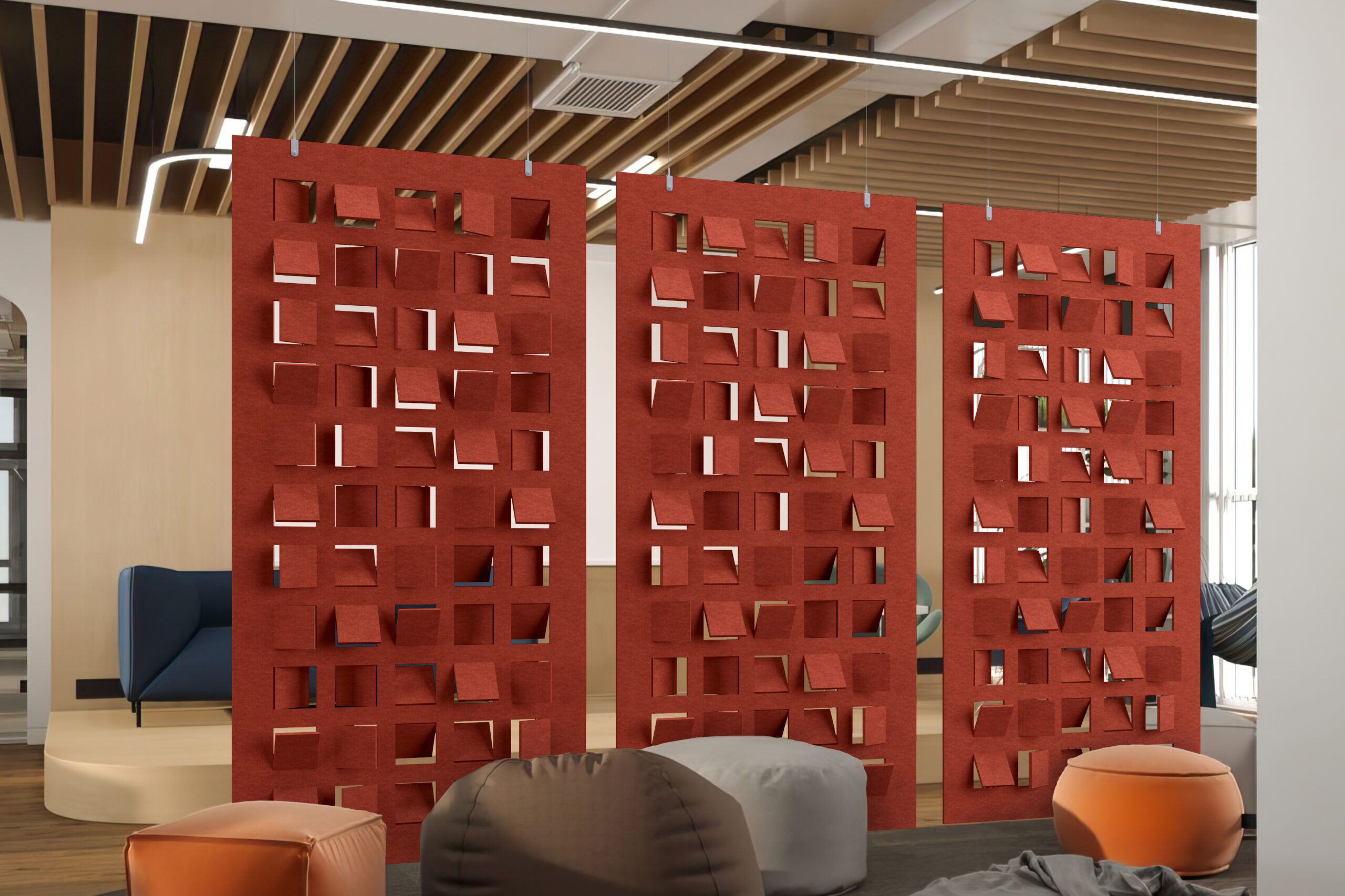 Flex is an art tapestry that provides nuance and comfort in any space through its sophisticated design collection. The versatility of cut-out designs and patterns enhances not just privacy but also aesthetic appeal, allowing you to customize your space effortlessly. Flex is available as a full hanging divider or modular hanging divider with different installation methods.