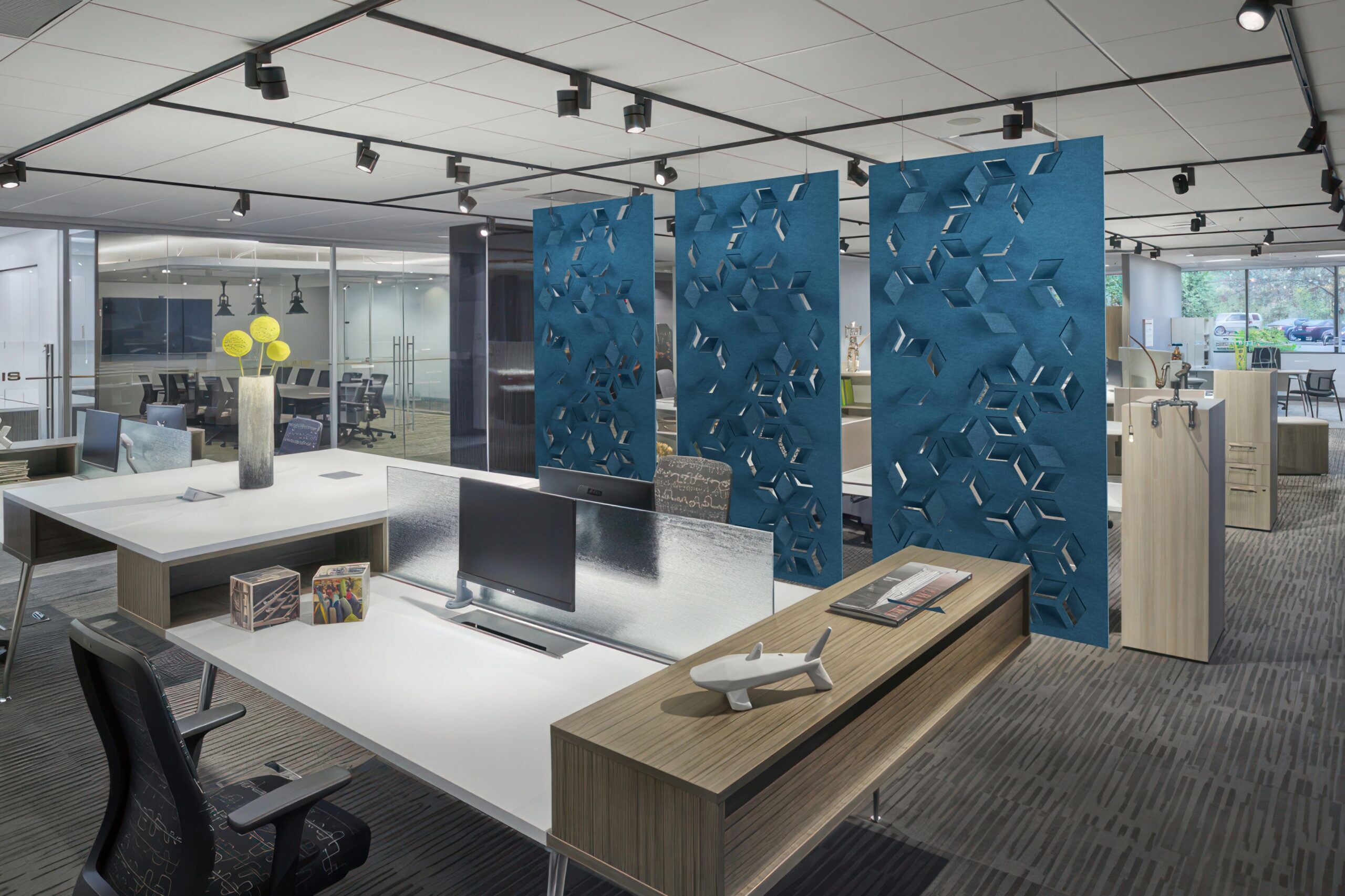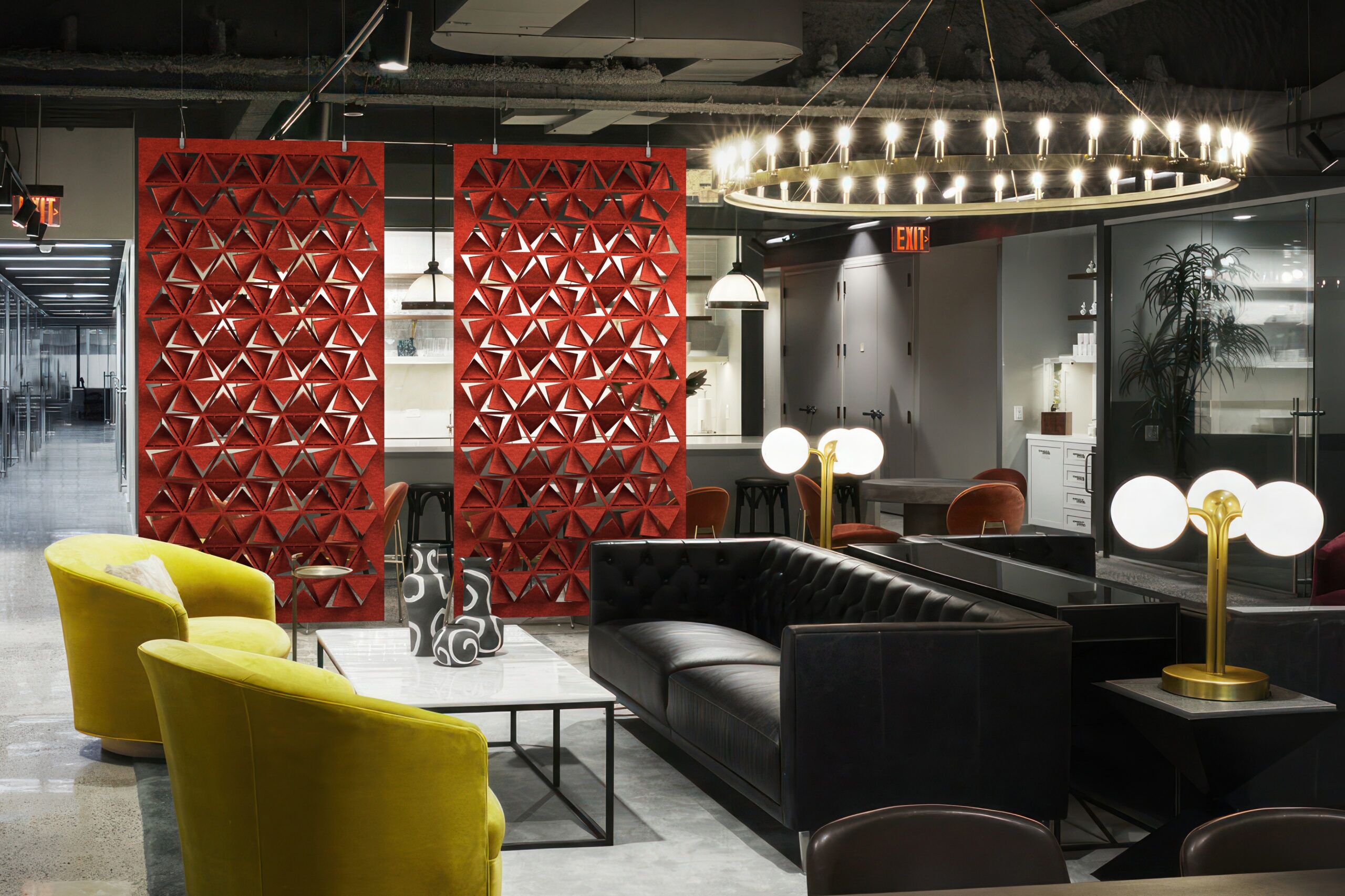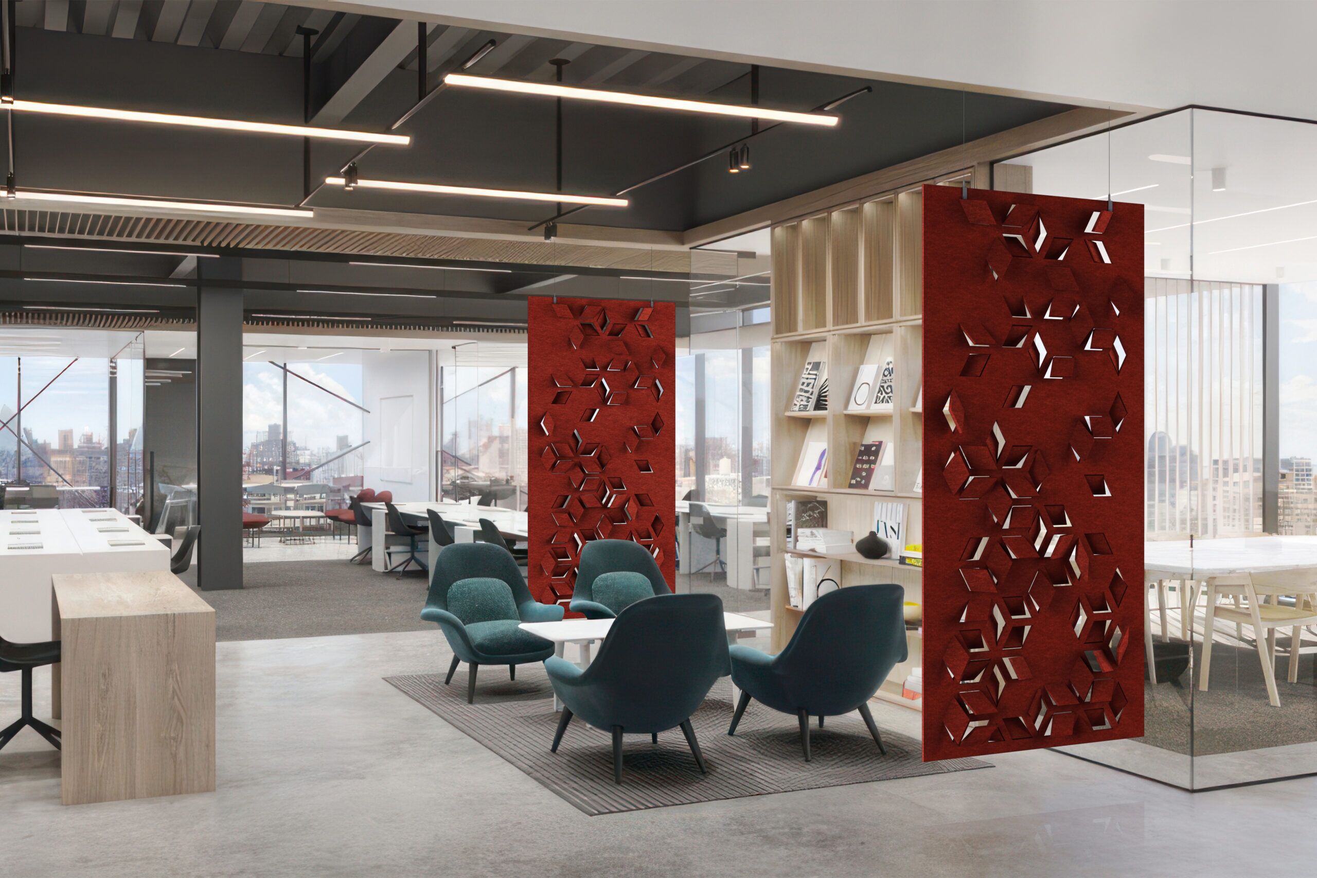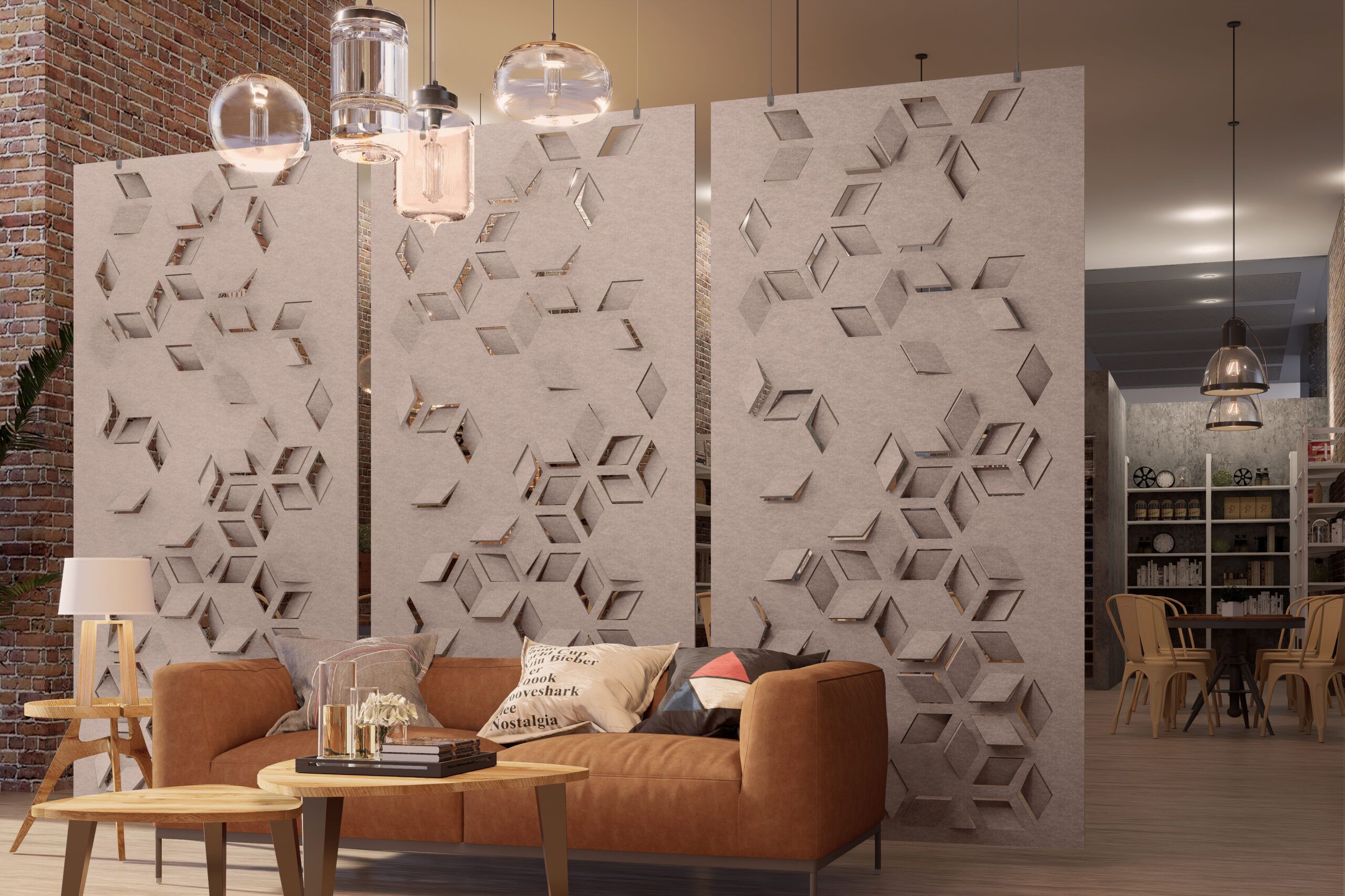 Flex is an art tapestry that provides nuance and comfort in any space through its sophisticated design collection. The versatility of cut-out designs and patterns enhances not just privacy but also aesthetic appeal, allowing you to customize your space effortlessly. Flex is available as a full hanging divider or modular hanging divider with different installation methods.